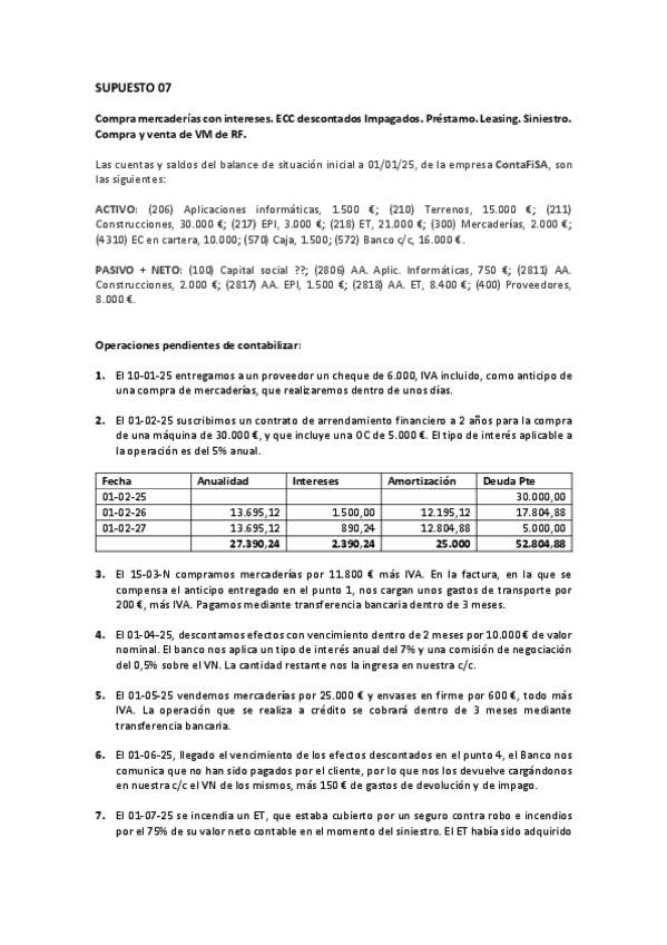Contabilidad 2º Grado Superior Administración y finanzas Supuesto 07 Compra mercaderías con intereses. ECC descontados Impagados. Préstamo. Leasing. Siniestro.