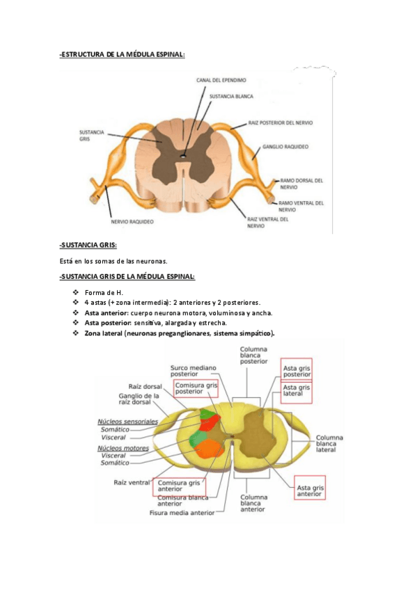 Resumen con imágenes y textos breves de el tema de medula espinal de anatomía humana de 1º de carrera.