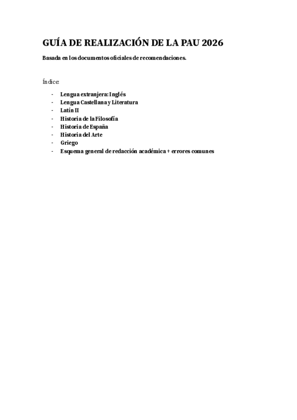 GUÍA DE REALIZACIÓN DE LA PAU 2026 Basada en los documentos oficiales de recomendaciones. Índice: - Lengua extranjera: Inglés - Lengua Castellana y Literatura - Latín II - Historia de la Filosofía - Historia de España - Historia del Arte - Griego - Esque