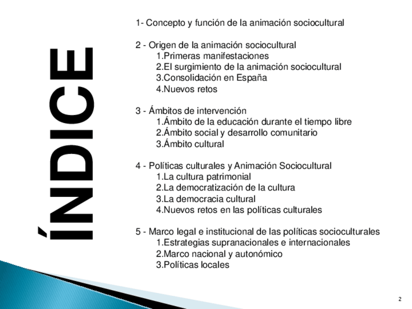 Estos apuntes tratan sobre el marco legal e institucional de las políticas socioculturales, el papel del animador sociocultural como agente de intervención social (funciones, aptitudes, valores y formación), los nuevos yacimientos de empleo en este ámbito