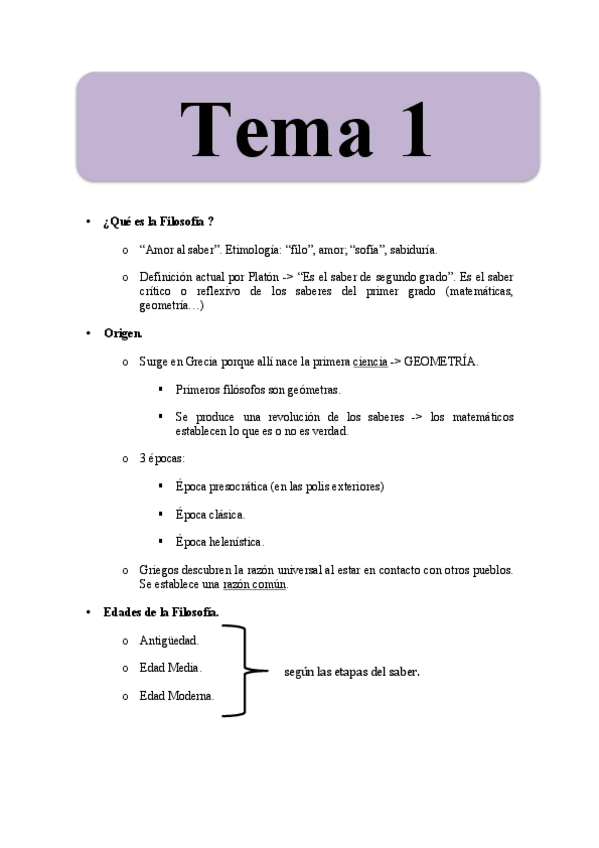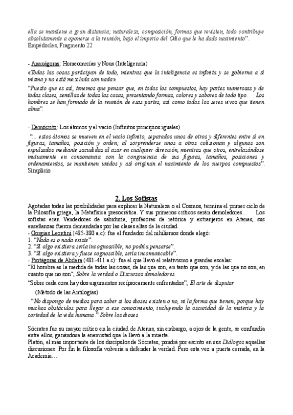 En este documento, tienes la teoría necesaria para el examen de filosofía de 1 de carrera de historia y patrimonio histórico, teneis los 4 bloques de la filosofía ; Clásica, Medieval, Moderna y Contemporánea