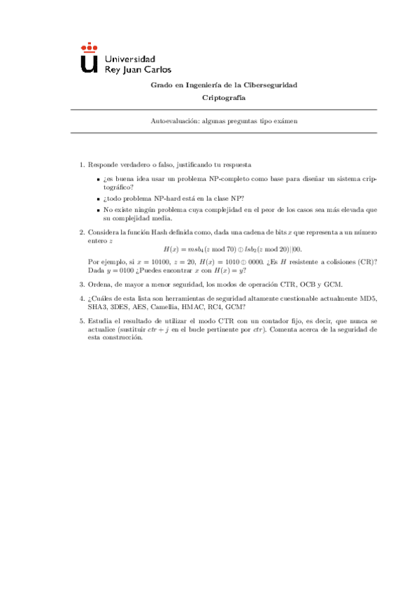 He publicado nuevos ejercicios de 1º Criptografía: Hoja 2 Ejercicios - Hashes y Aleatoriedad.pdf