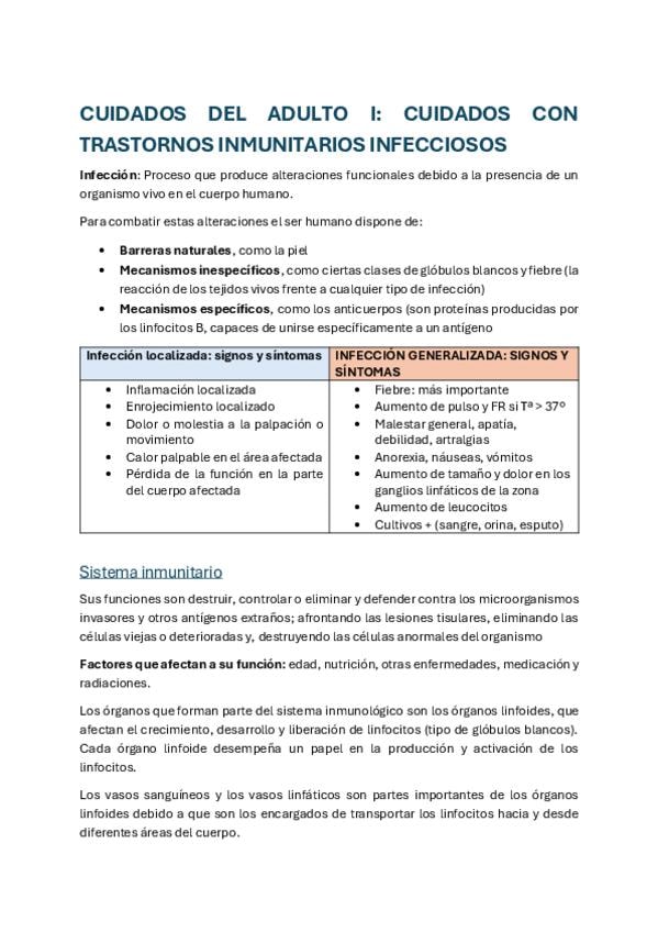 Apuntes Adulto I: cuidados del paciente infeccioso inmunodeprimido. APUNTES CON NOTAS DE CLASE