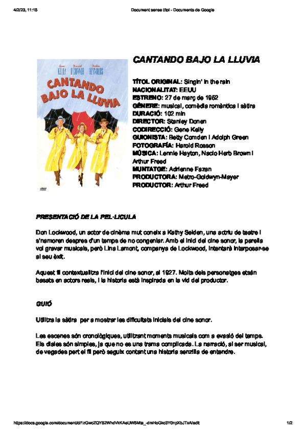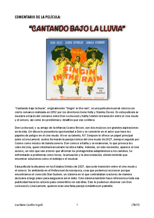 Análisis guiado de la película musical Singin' in the rain (Bailando bajo la lluvia) de 1952 dirigida por Gene Kelly y Stanley Donen.