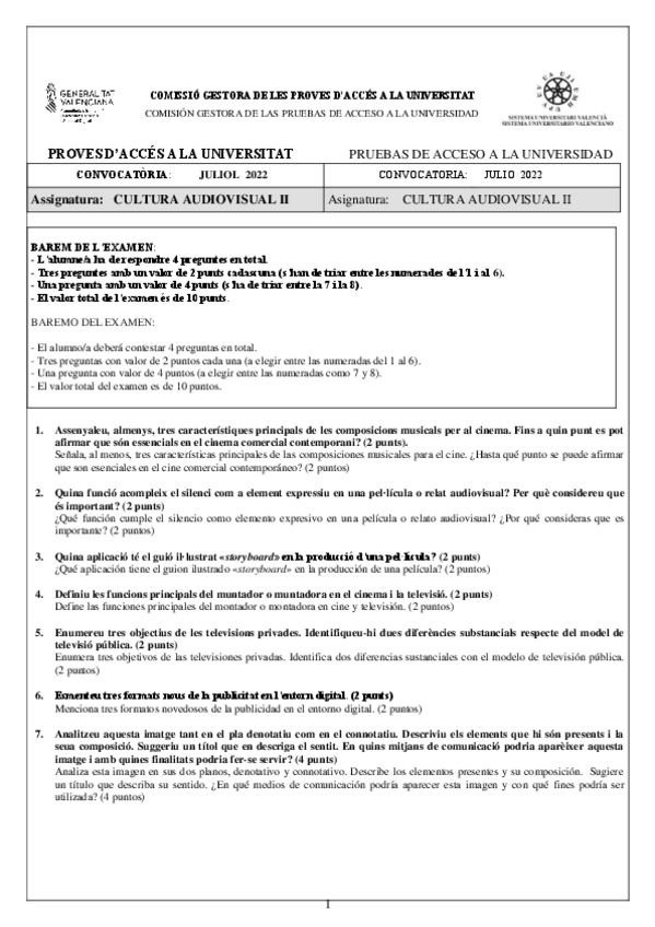 Exámenes Cultura Audiovisual II PAU 2022