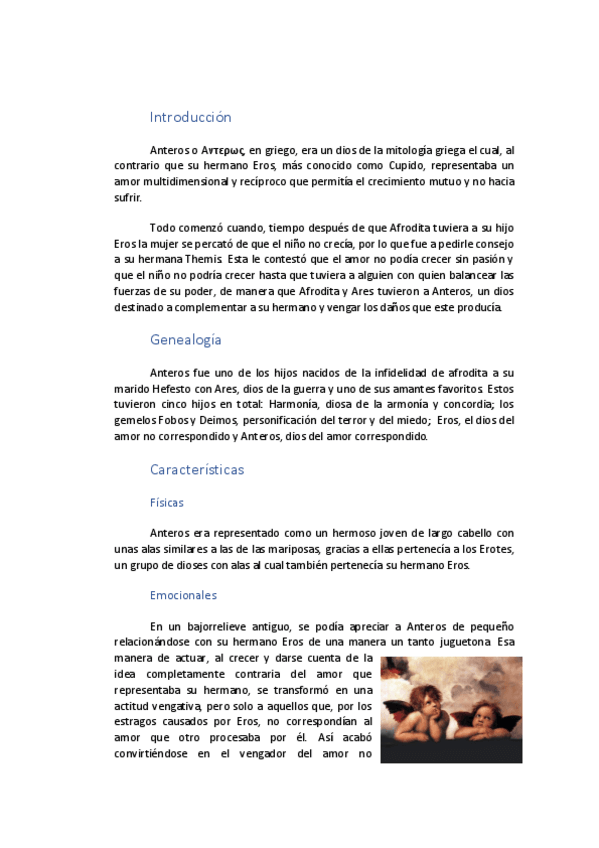 Trabajo sobre Anteros. Incluye introducción, genealogía, características, atributos, apariciones, mito, curiosidades y conclusion.