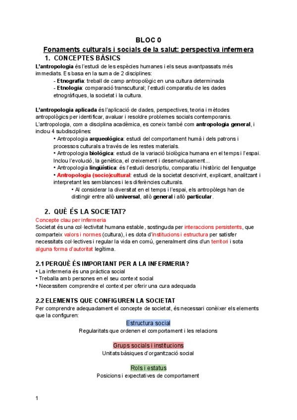 Resum del bloc 0: Fonaments culturals i socials de la salut: perspectiva infermera.