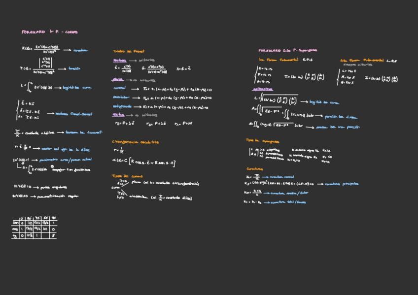 Un resumen del contenido del parcial 2 de Curvas y Superficies para repasar las fórmulas mas importantes