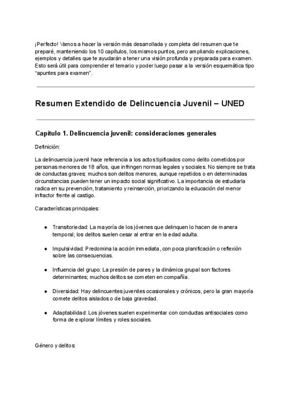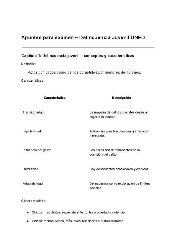 “apuntes para examen”, mucho más visual y esquemática, con tablas, listados y frases clave para memorizar rápido los 10 capítulos de Delincuencia Juvenil (UNED).