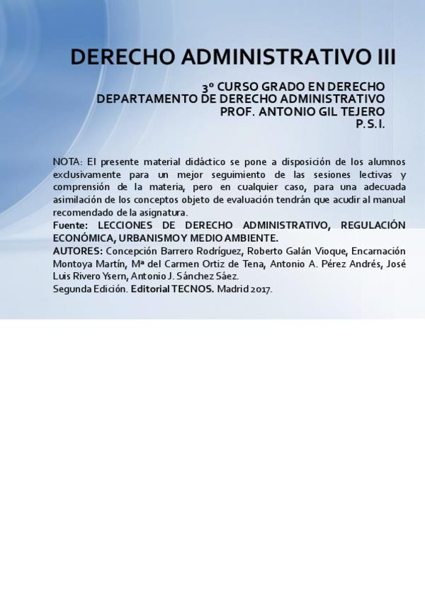 Gil Tejero: son las diapositivas que da en clase más lo que explica en clase. Las diapositivas son un resumen del manual de Lecciones de Derecho Administrativo, volumen III, 2ª edición (TEMAS 1, 2 Y 3). Bonilla Ruiz: resumen del manual (TEMAS 4,5,6,7,8,9