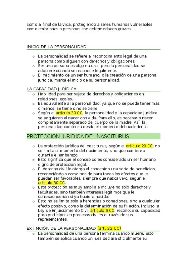 1. Començament i final de la personalitat. A) Començament de la personalitat B) Situació jurídica del concebut i no nascut C) Reserva de drets en favor dels no concebuts D) Extinció de la personalitat E) Premoriència i commoriència F) Prova de la mort 2.