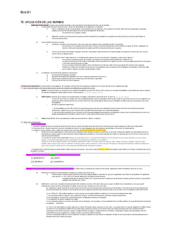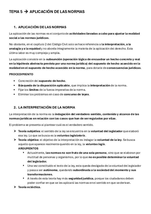 Apuntes del tema 5 de derecho civil sobre la aplicación de las normas y todos sus apartados.