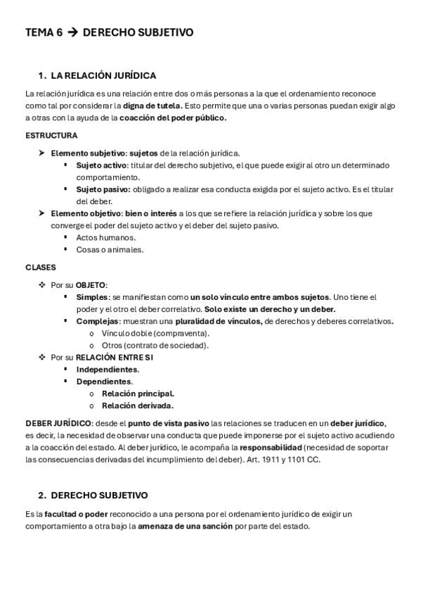 Apuntes tema 6 de derecho civil sobre derecho subjetivo. Contiene el nacimiento, adquisición, modificación y extincion del derecho subjetivo, su ejercicio y sus límites. También está la prescripción y la caducidad.