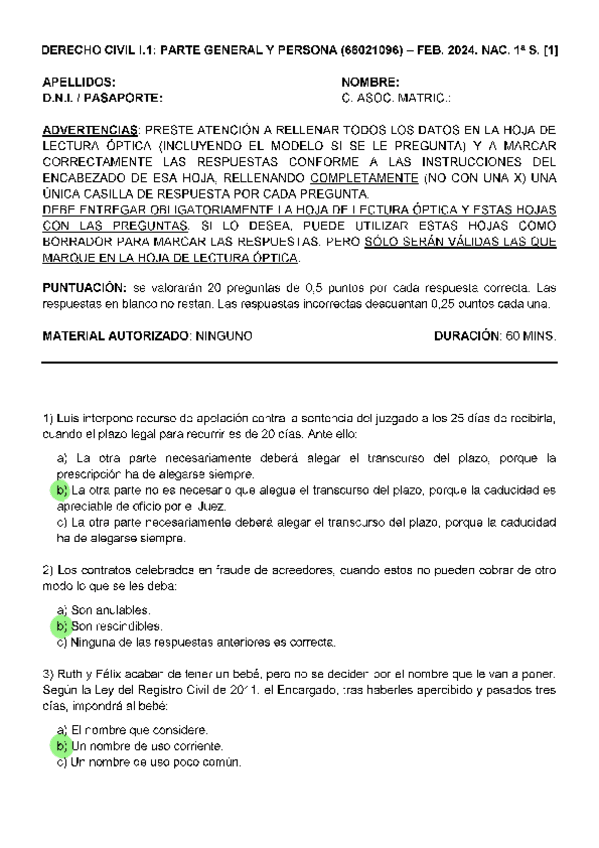 EXAMENES RESUELTOS AÑO 2023-2024 DEREHCHO CIVIL I : PARTE GENERAL Y PERSONA