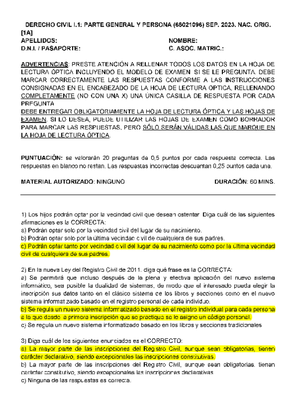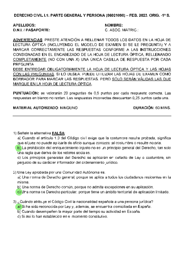 EXAMENES RESUELTOS AÑO 2022-2023 DERECHO CIVIL I : PARTE GENERAL Y PERSONA