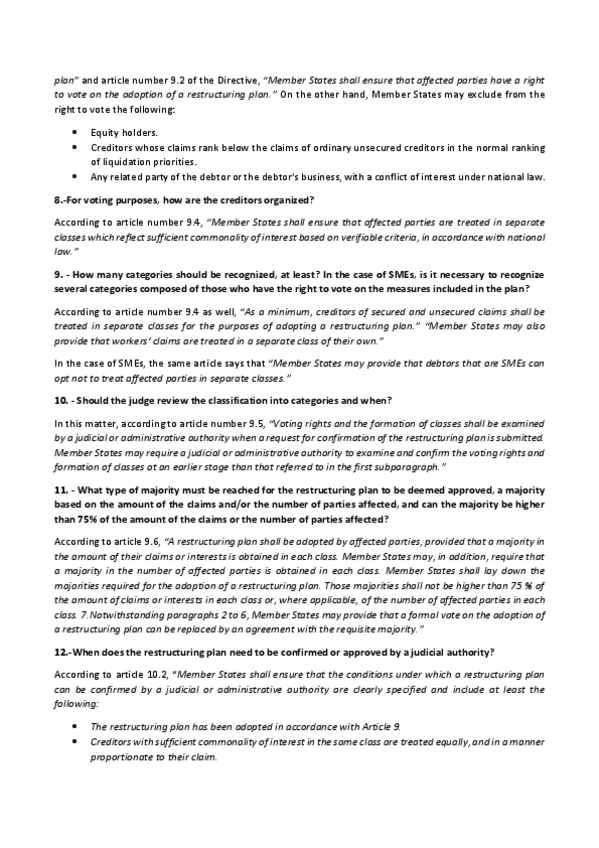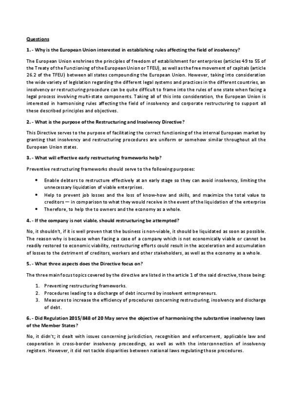 Solved questionnaire on EU Directive 2019/1023 on Insolvency law and corporate restructuring