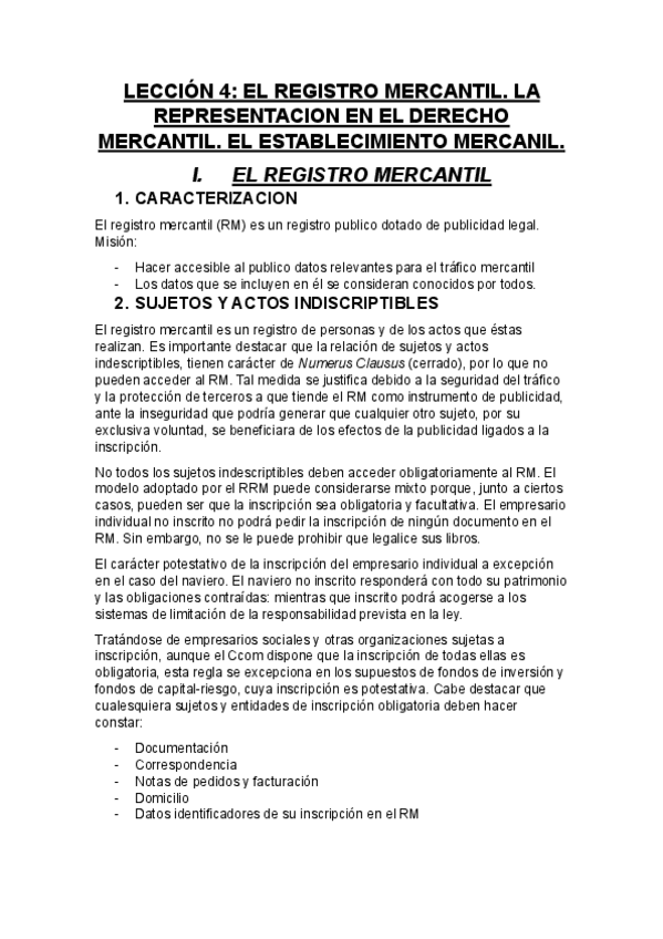 EL REGISTRO MERCANTIL. LA REPRESENTACIÓN EN EL DERECHO MERCANTIL. EL ESTABLECIMIENTO MERCANTIL