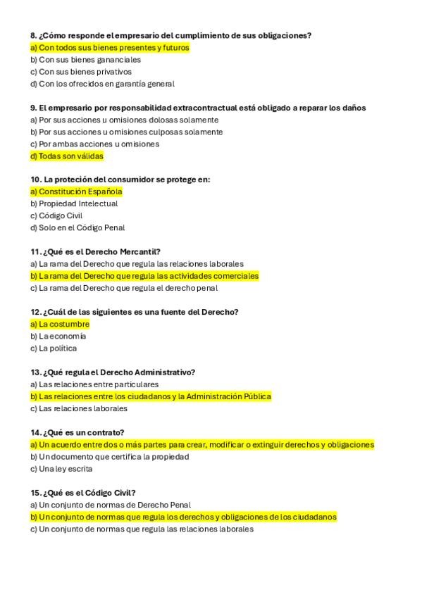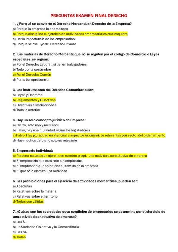Preguntas de exámenes anteriores de Derecho de la Empresa con solución subrayada