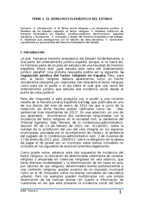 Apuntes completos del tema 1: EL DERECHO ECLESIASTICO, ordenados y resumidos del manual de la clase de Derecho Eclesiástico del Estado curso 2025/26 de Alberto Aldamunde Miranda, efectivos para aprobar parciales y examen final