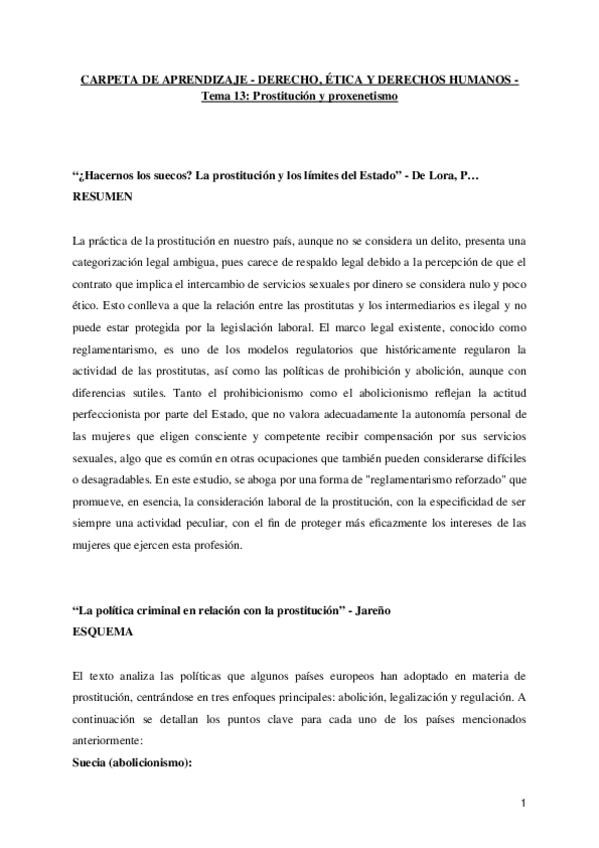 Apuntes de Derecho, Ética y Derechos Humanos, Carpeta de aprendizaje sobre la prostitución y el proxenetismo