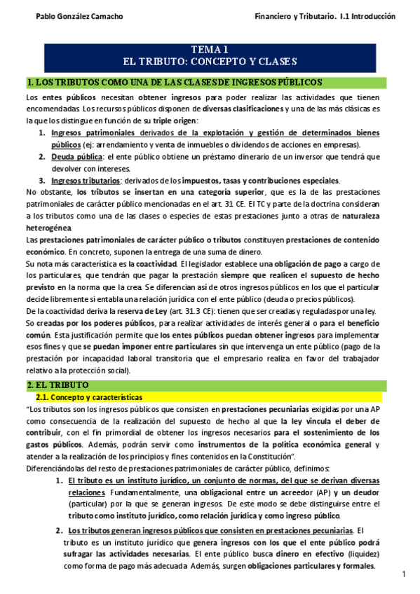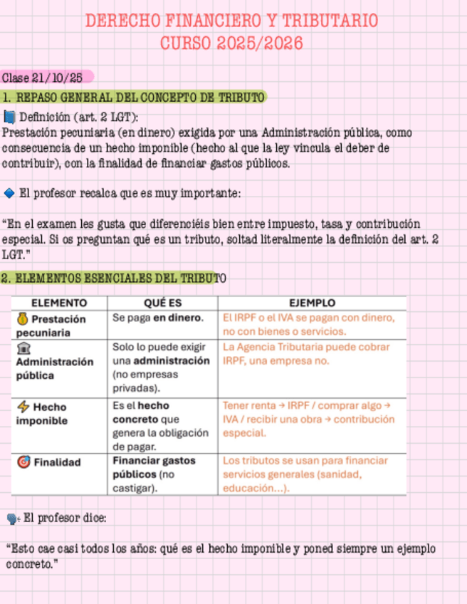 Apuntes completos, visuales y súper claros de la clase de Financiero y Tributario 1.1 (21/10). Incluye: ✔️ Explicaciones sencillas ✔️ Esquemas visuales ✔️ Ejemplos en cada apartado ✔️ Diferencias entre impuesto, tasa y contribución especial ✔️ Criterios