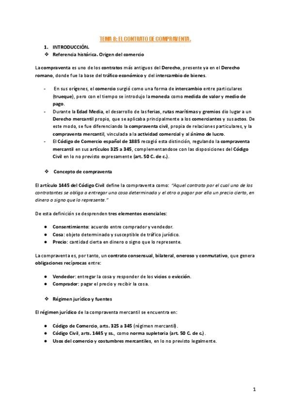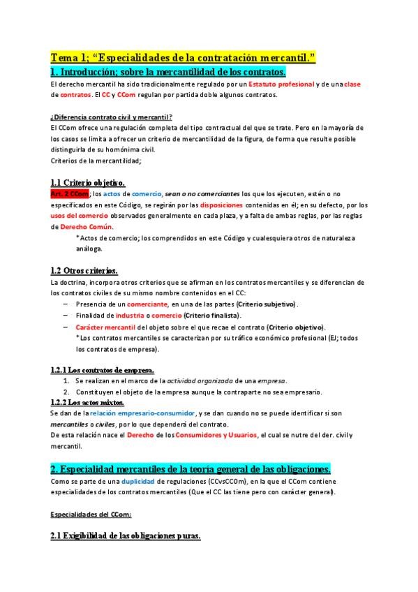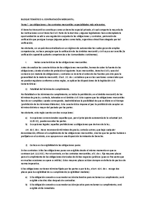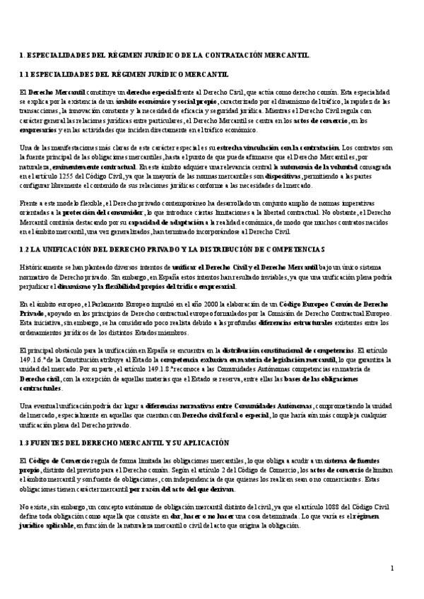 1-. Introducción sobre mercantilidad de los contratos. 2-. Especialidades mercantiles de la teoría general de las obligaciones. 3-. Especialidades mercantiles de la teoría general de los contratos. 4-. Condiciones generales de contratación. 5-. Contrataci
