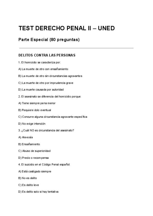 CreadoresTEST DERECHO PENAL II – UNED Parte Especial (80 preguntas) EXAMEN COM PREGUNTAS Q CAEN SI O SI