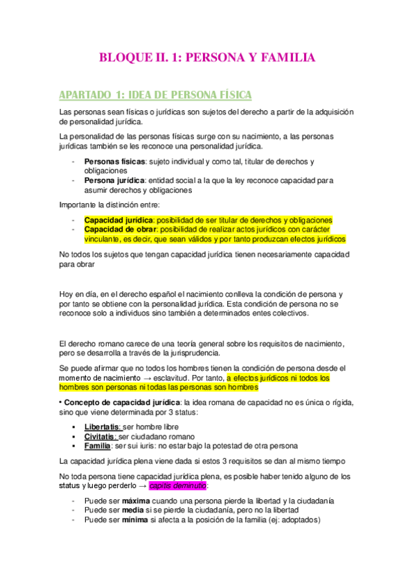 Apuntes de derecho romano del bloque 2. 1 que contienen derecho de la persona y familia.