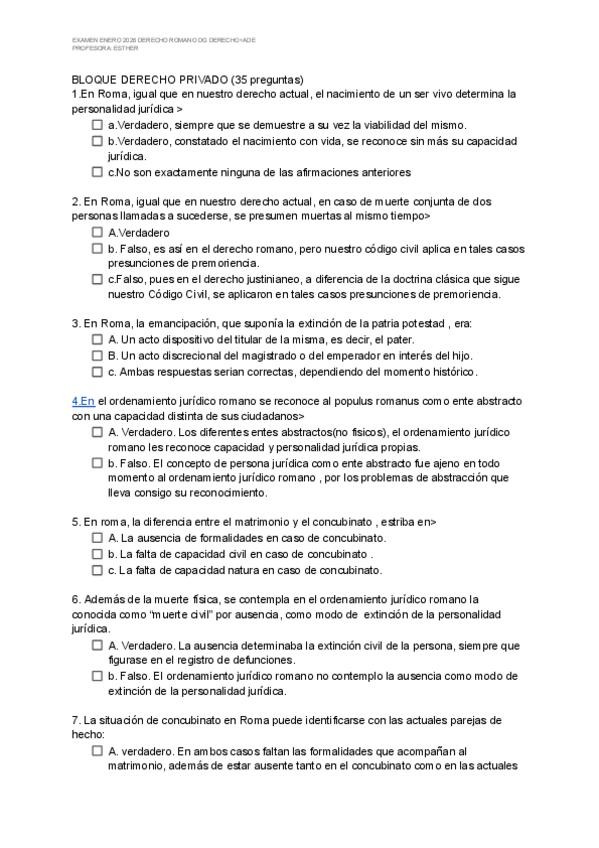 Es el examen de enero de 2026, tipo test de derecho romano público de la profesora Esther. Los que están con un tick son las que sabemos que son la respuesta correcta correcta y las demás son las opciones que te da el examen.