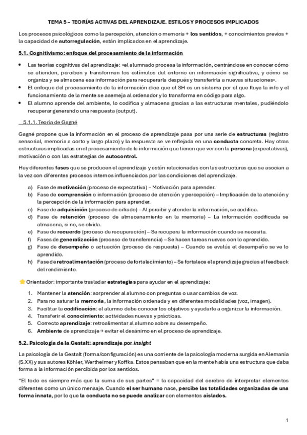 Resumen T5- Teorías Activas del Aprendizaje. Estilos y procesos implicados de la universidad Isabel I (Asignatura obligatoria)