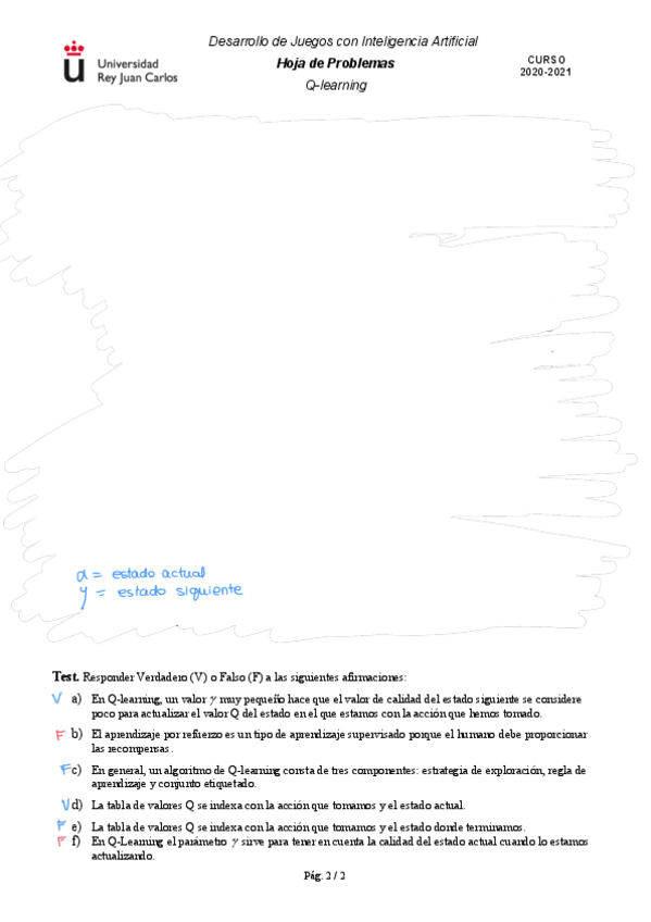 He publicado nuevos ejercicios de 3º Desarrollo de juegos con inteligencia artificial: Ejercicios - Bloque 2 - Tema 5. Q-Learning.pdf