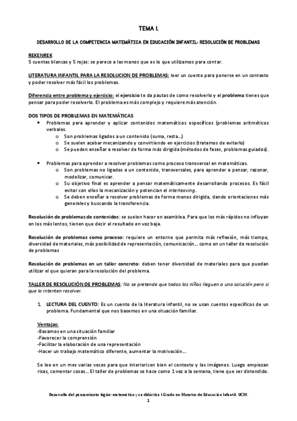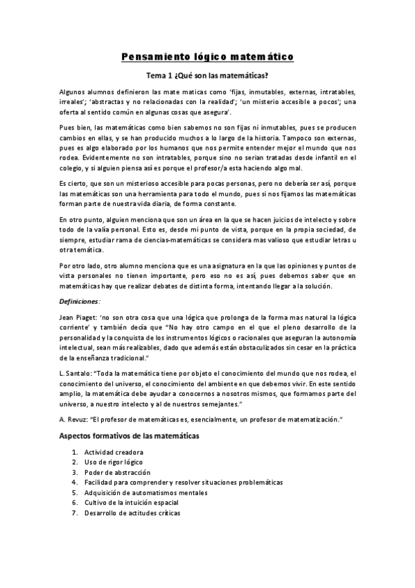 Pdf donde se reúne la información de los siguientes temas de la asignatura Pensamiento Lógico y su Didáctica I: -La actividad matemática en la Educación Infantil - Las actividades lógicas en la Educación Infantil - El número natural en la Educación Infant