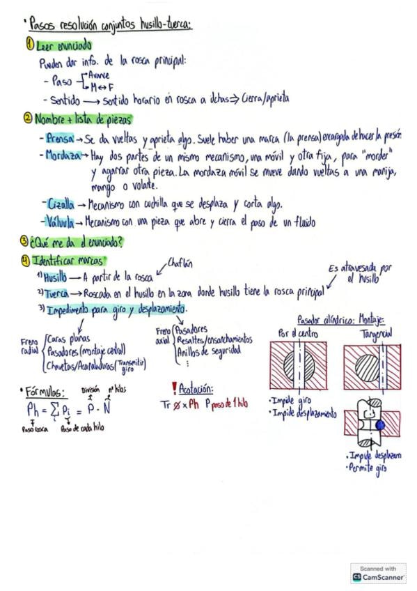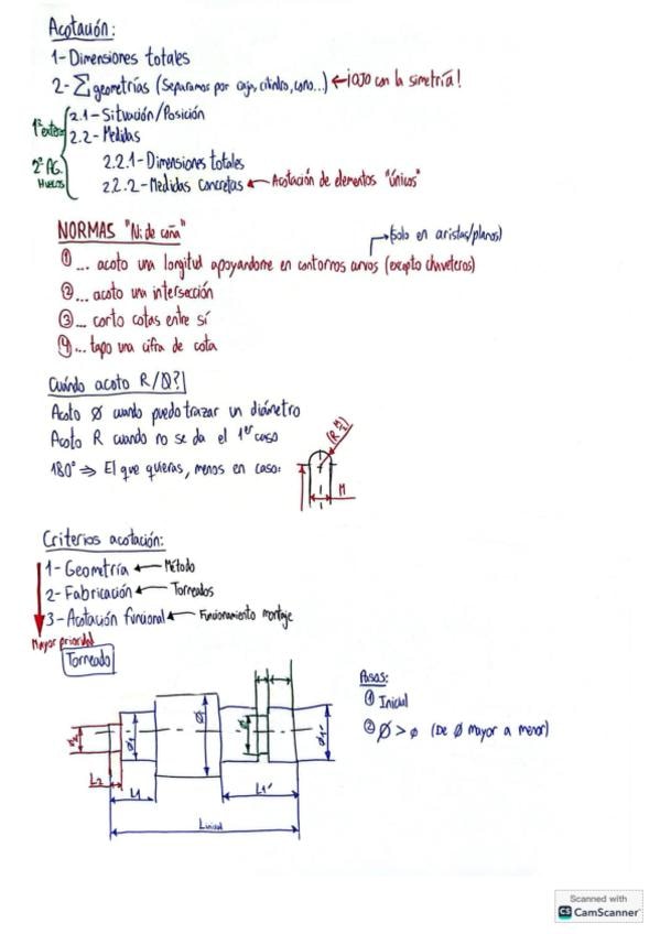Resumen de algunos de los conceptos de: Unión Roscada, explicando husillo-tuerca; Engranajes con 2 ejercicios con cálculos y acotación resuelta; Acotación funcional de Ejes con un ejemplo