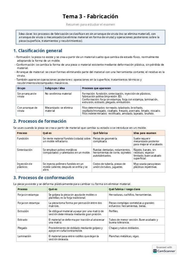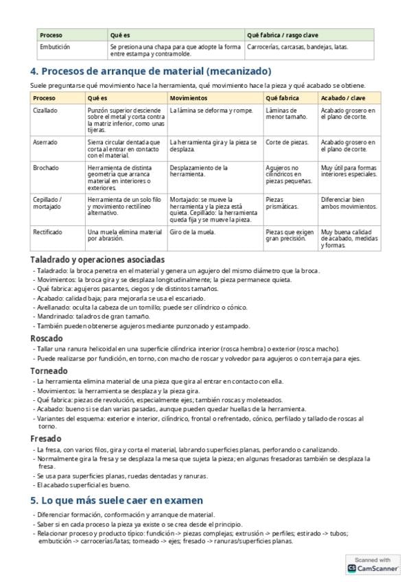 Resumen de los distintos procesos de fabricación clasificados y explicados en tablas