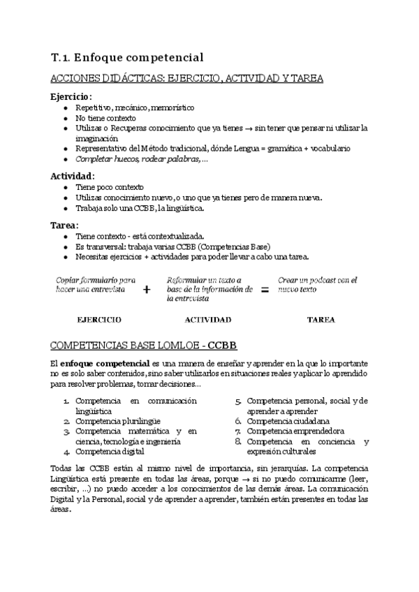 Apuntes de clases orales - enfoque competencial: Ejercicio, actividad, tarea Competencias Base-CCBB (que en realidad son competencias clave de la LOMLOE pero ella les llama mal)