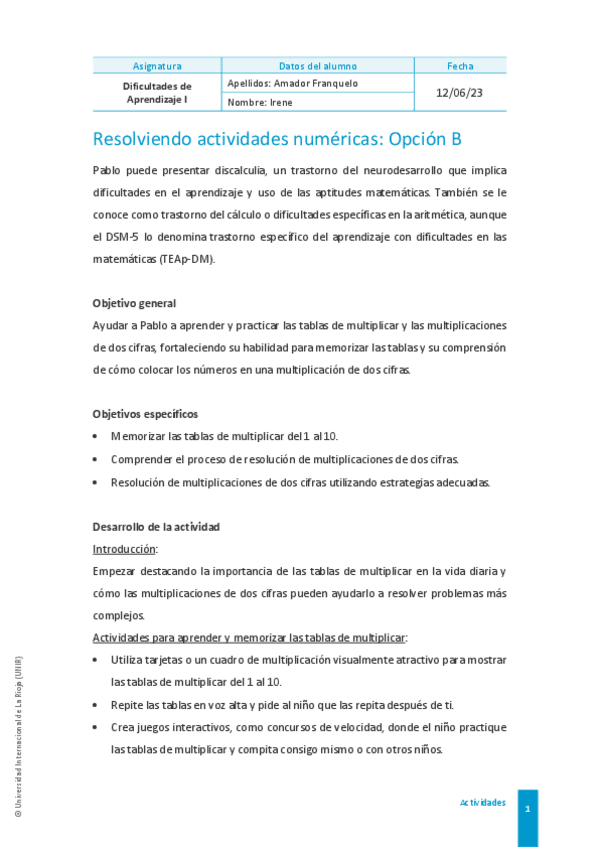 Actividad: Caso práctico de dificultades de aprendizaje en matemáticas