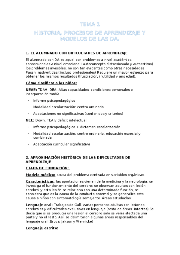 Tema 1. Historia, modelos, concepto y clasificación de las dificultades de aprendizaje