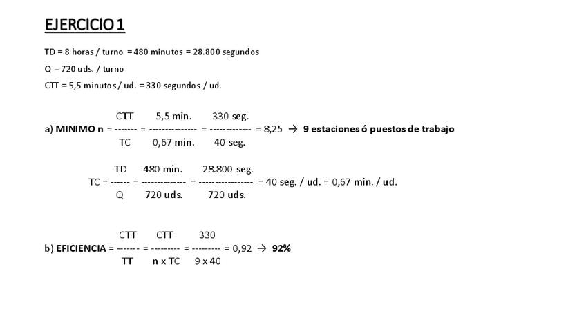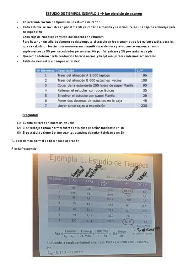 Ejemplo 1 del power del profe, de la última parte del tema 2 "Estudio de tiempos", RESUELTO EN CLASE. Fue ejercicio en un EXAMEN FINAL de un curso anterior.