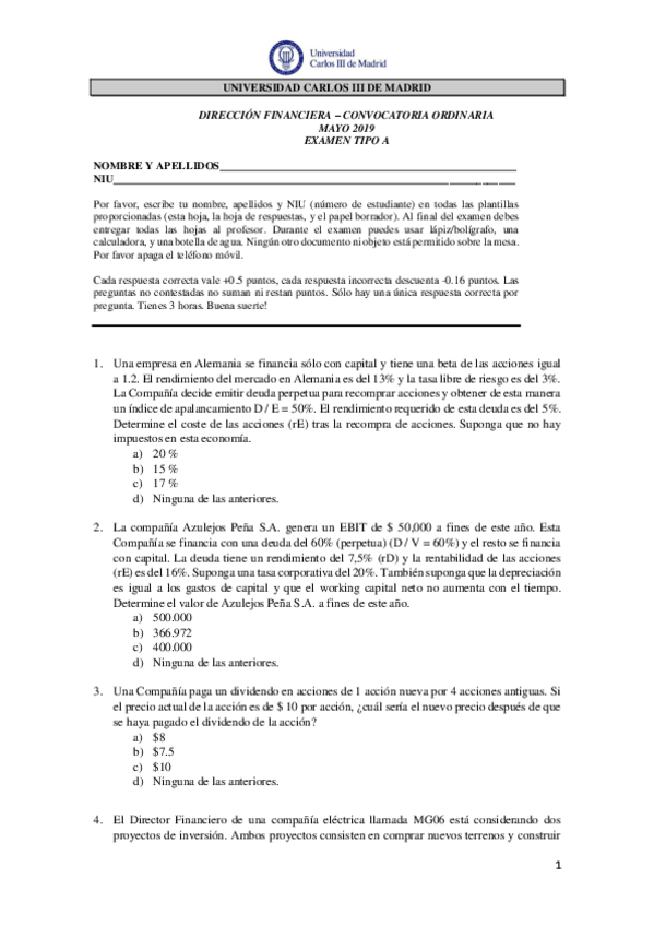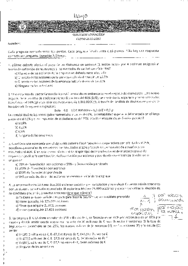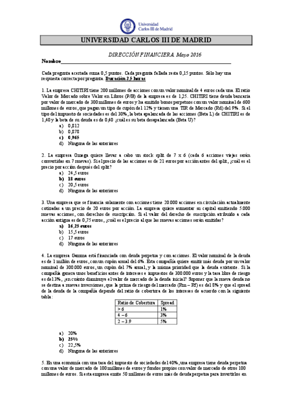 Exámenes repaso Dirección Financiera
