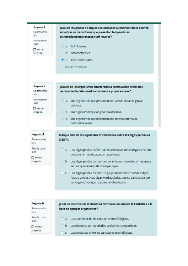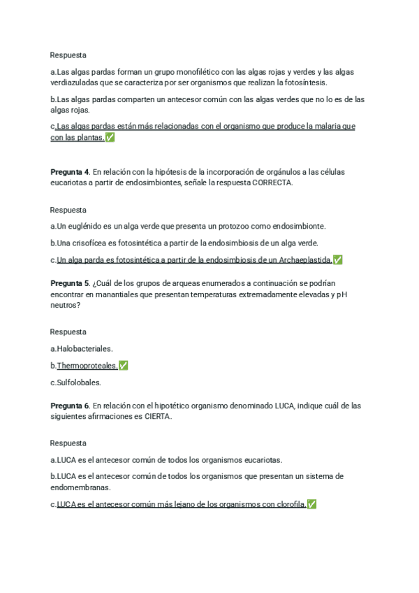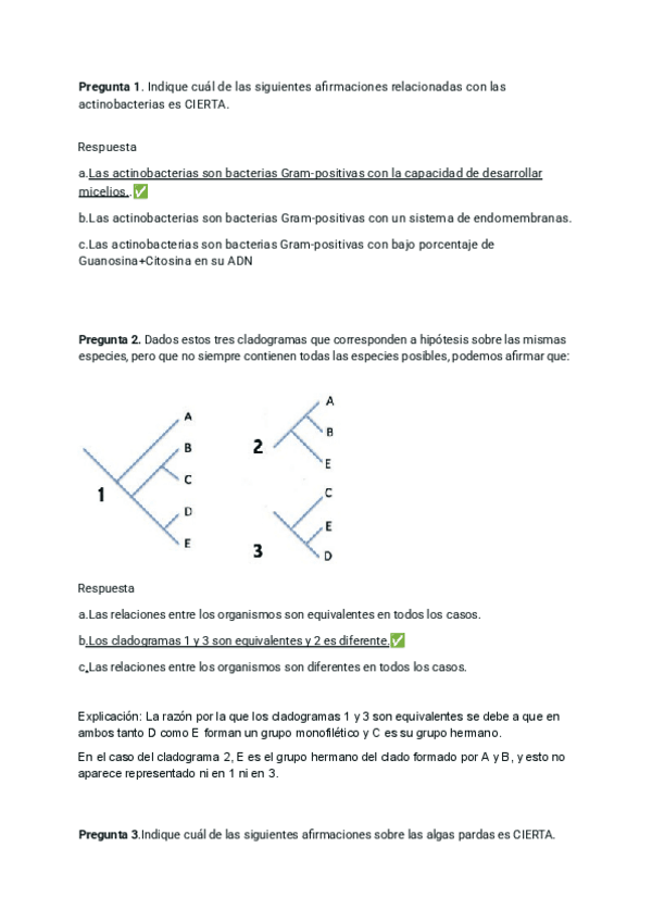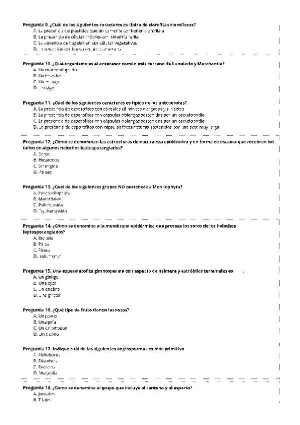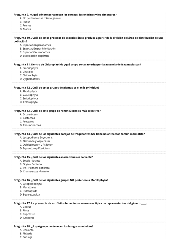 Prueba Examen del tema 1, 2 y 3 de diversidad vegetal con las respuestas y pequeña explicación de algunas preguntas.