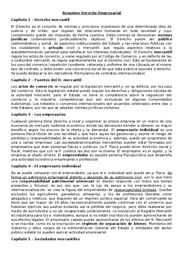 Resumen compacto por capítulos de todo el manual de Derecho Empresarial.