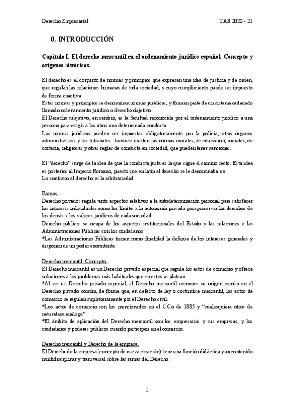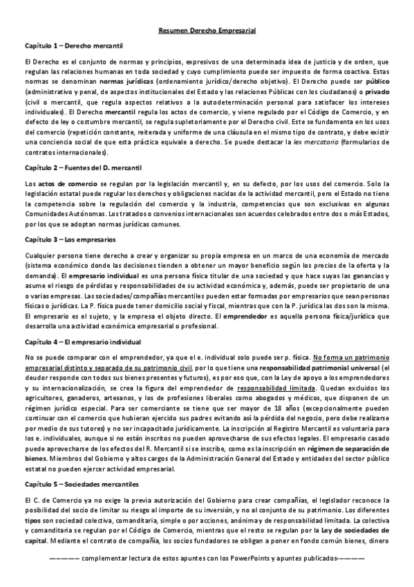 Resumen compacto por capítulos de todo el manual de Derecho Empresarial.