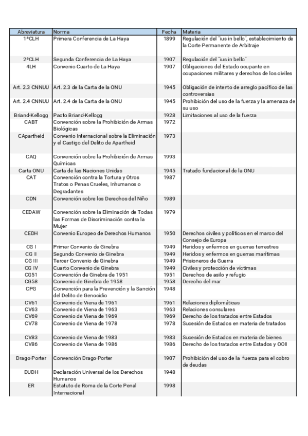 Recopilación de toda la normativa mencionada a lo largo del curso 20405 Derecho Internacional Público, en orden cronológico, con sus respectivas abreviaturas y una breve descripción de su contenido