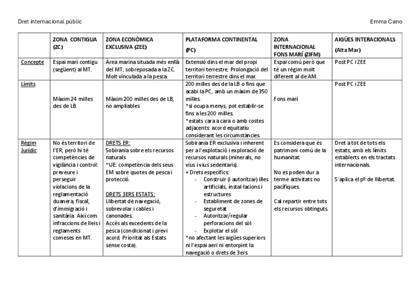 Taula explicativa dels límits del territori d'un estat al mar; aigües interiors, mar territorial, zona econòmica, etc.