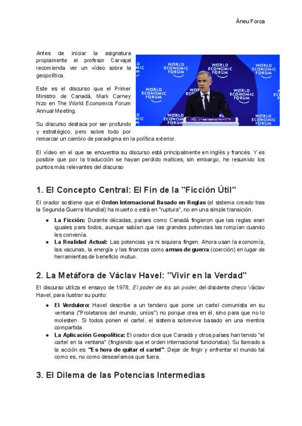 Antes de iniciar la asignatura propiamente el profesor Carvajal recomienda ver un vídeo sobre la geopolítica. Un discurso en ingles/francés de Mark Carney. El texto esta traducido con sus ideas principales