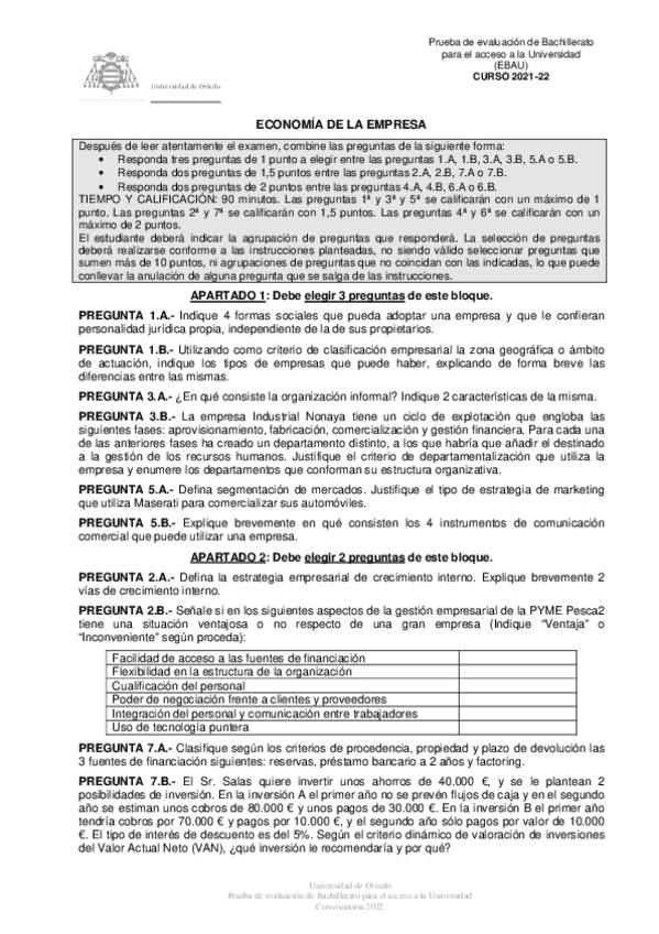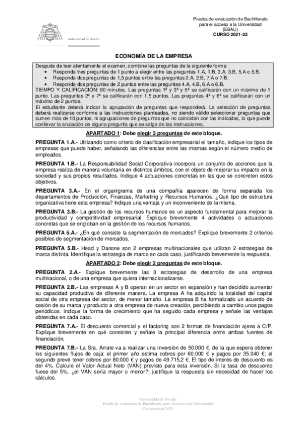Exámenes Economía de la Empresa EBAU 2022