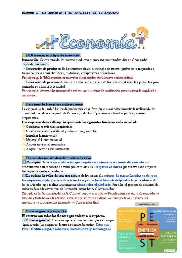 Estos apuntes de economía pertenecen al bloque i de la PAU 2026, apuntes corregidos por el profesor, bien organizados y los contenidos son: la innovación, funciones de la empresa, cadena de valor, entorno general y específico, entorno empresarial EN CANA