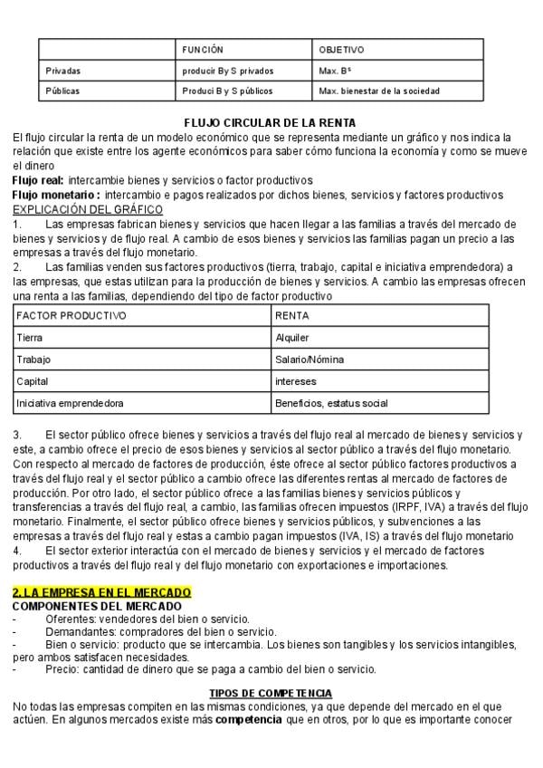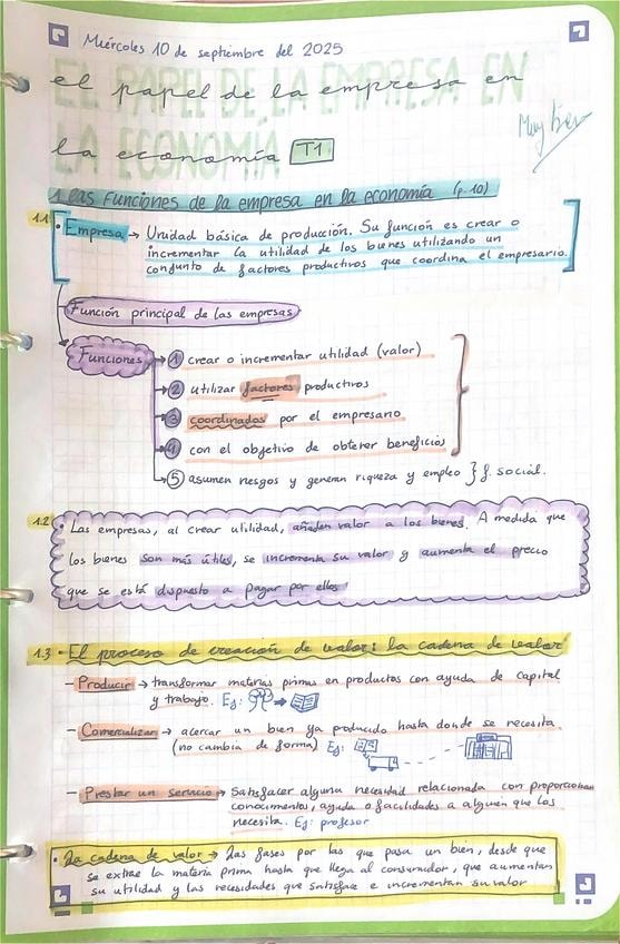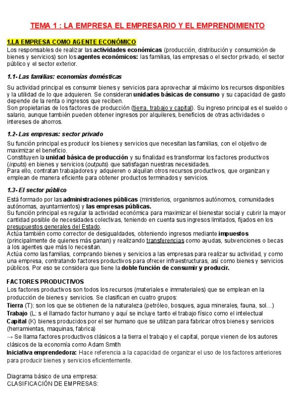 Apuntes del tema 1 (LA EMPRESA EL EMPRESARIO Y EL EMPRENDIMIENTO) de economía para 2 de Bachillerato y para la PAU, con explicaciones tanto de la teoría como de la práctica