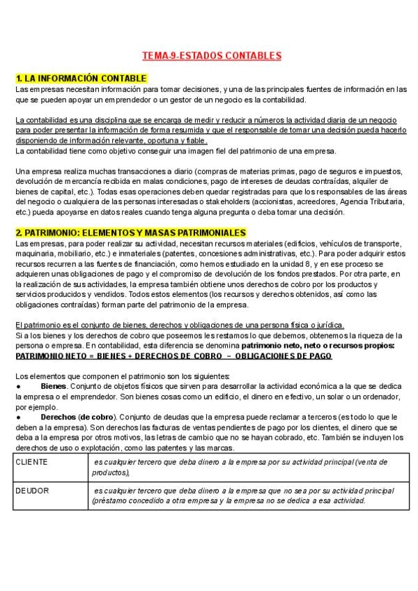 Apuntes del tema 9 de Economia de la Empresa: ESTADOS CONTABLES Para 2 de Bachillerato y para la PAU con la teoria explicada