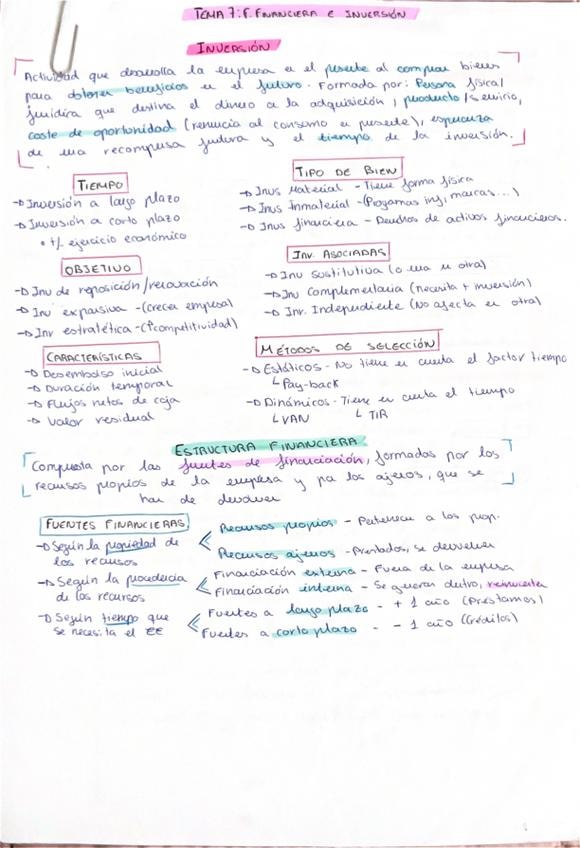 Teoría ordenada, completa y esquematizada del tema de financiación e inversión